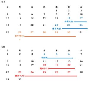 ※大分市内の中学校の行事をまとめて図式化したものです。通常、体育大会は1日、期末テストは1~2日間で行われます。