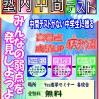 こんにちは!Yes進学セミナーです。 本塾では、中学生対象の「塾内中間テスト」を実施いたします! 中学生の1学期期末テストに向けて、 新学年における履修内容をどのくらい理解しているかを確認するための、1学期期末に向けた模 …